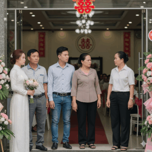 Ngày cưới, trời đổ mưa phùn từ lúc tờ mờ sáng. Đám cưới vốn định tổ chức ngoài sân vườn, giờ chuyển vội…